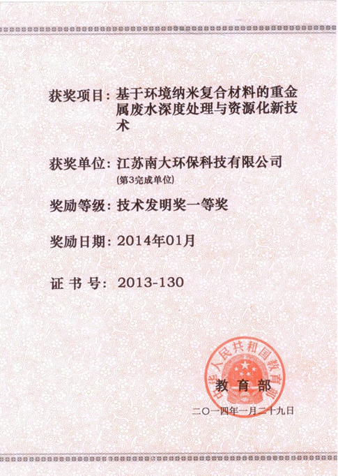 近日,由澳门新葡京娱乐城与南京大学、陕西科技大学共同完成的《基于环境纳米复合材料的重金属废水深度处理与资源化新技术》项目,荣获2013年度教育部颁发的技术发明奖一等奖。